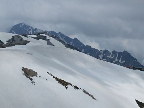 心配したお天気も大走り尾根の雪もなんとか大丈夫そう。 ただし、雪が少ない分、シール登行にはちょっと手こずる。 2時間半あまりかかって辿り着いた内蔵助カールの斜面は、他とはまったく違っていわゆる「面ツル」。 内蔵助山荘の向こうには剱八ツ峰が見え…
